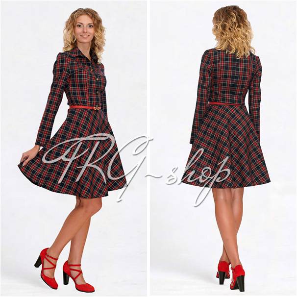 Платье в клетку с планкой на пуговицах и потайной молнией, которая находится сбоку. Юбка отрезная по талии с фатином и подкладкой.