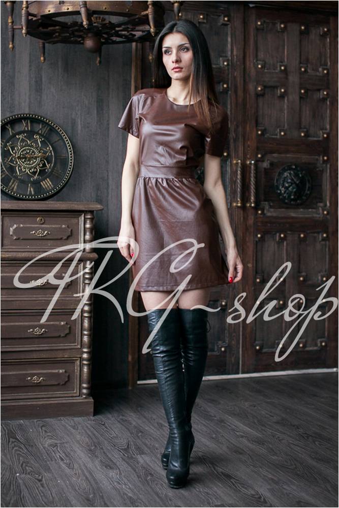 Платье коричневого цвета с простроченным поясом. Выполнено из эко кожи на хлопковой основе