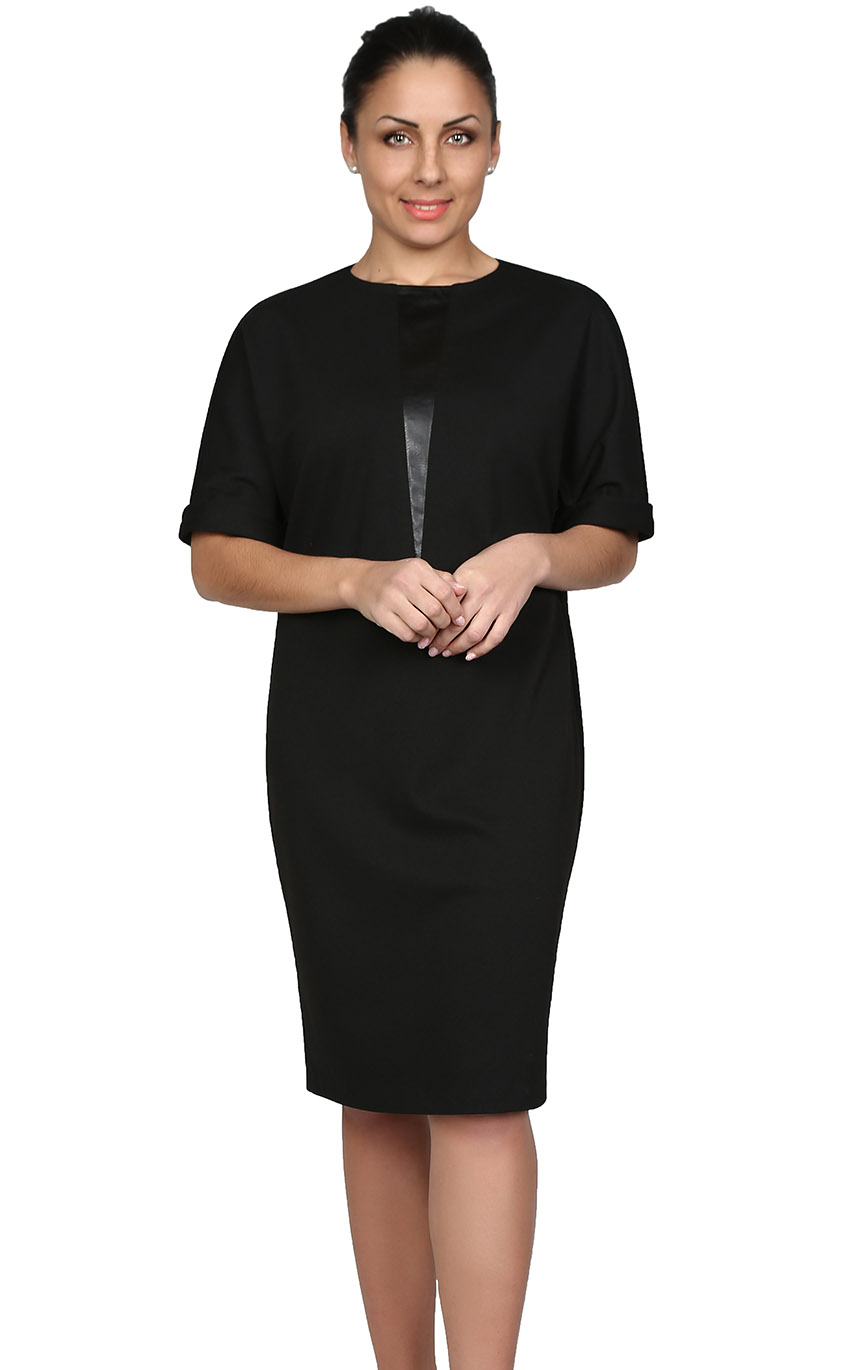 Платье бочкообразного силуэта, с декоративной кожаной вставкой по полочке.
