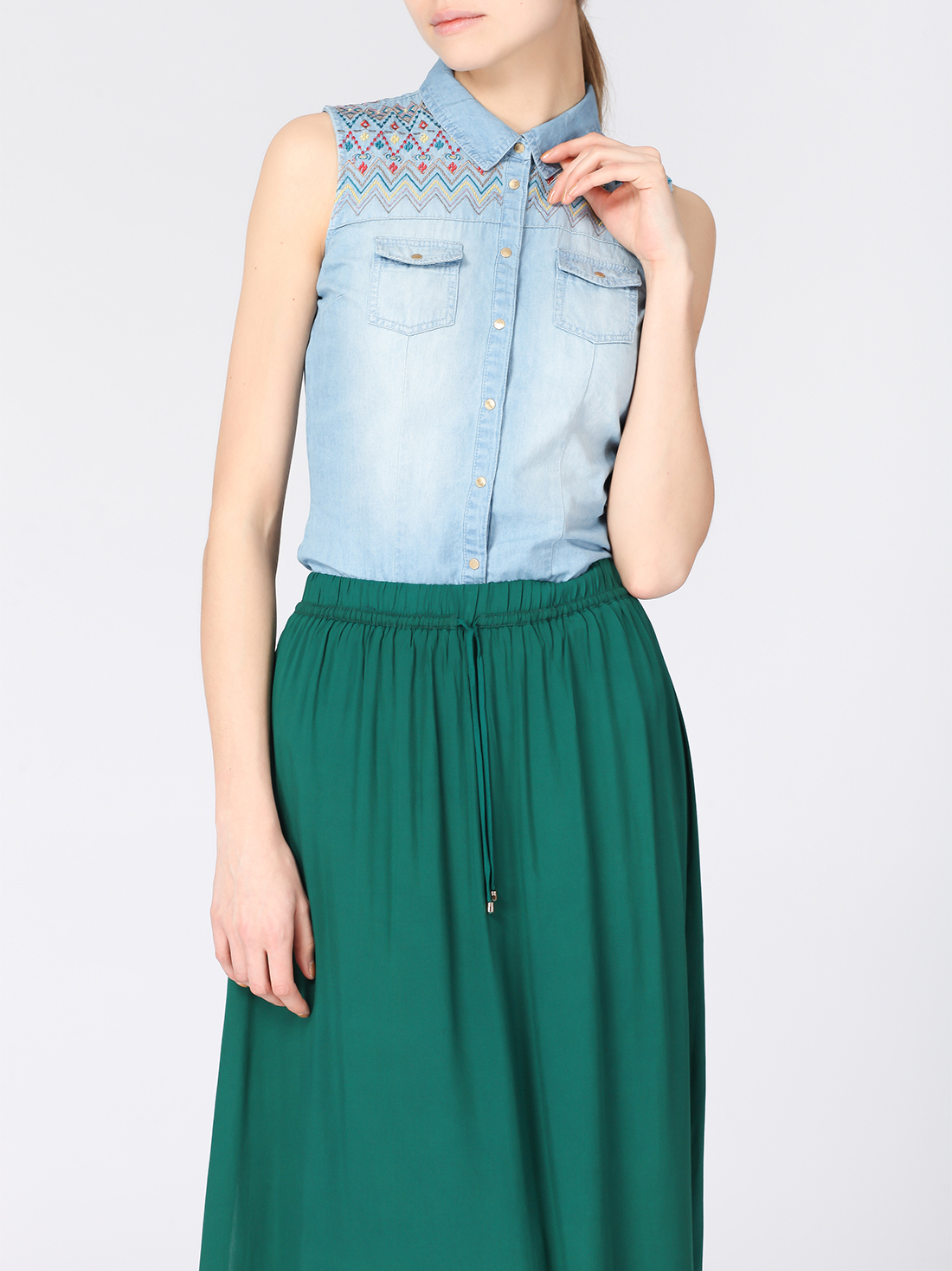 Рубашка с вышивкой на кокетке и накладными карманами.